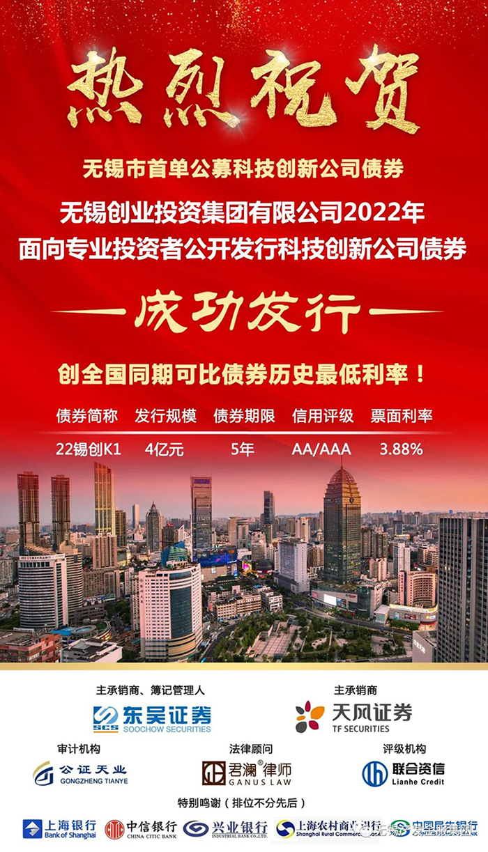 無(wú)錫創(chuàng)投集團(tuán)成功發(fā)行無(wú)錫市首單公募科技創(chuàng)新公司債券