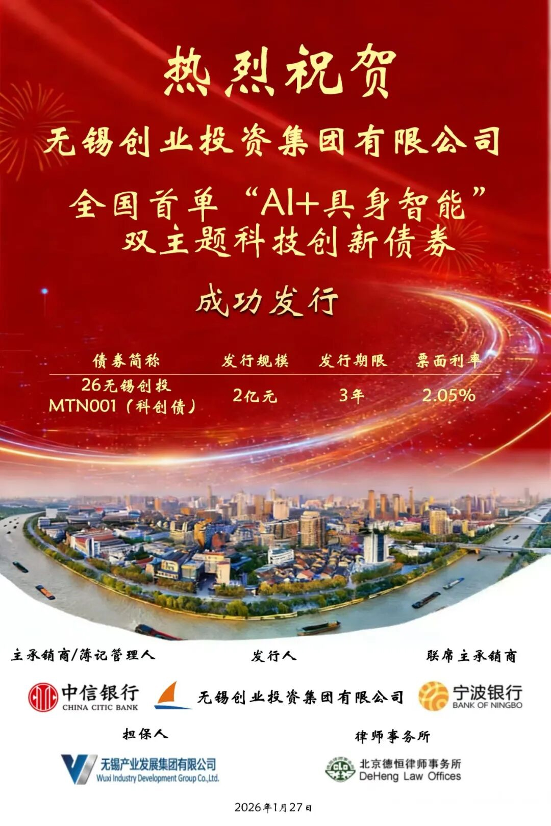 1月27日,全國首單同時聚焦“人工智能”與“具身智能”的主題科技創(chuàng)新債券在錫發(fā)行。無錫創(chuàng)業(yè)投資集團有限公司成功發(fā)行2026年第一期中期票據(jù),規(guī)模2億元,集中投向人工智能與具身智能賽道。這是繼去年成功發(fā)行全國首批科技創(chuàng)新債券后,創(chuàng)投集團再次運用金融創(chuàng)新工具,精準引導(dǎo)社會資本投向科技前沿,為無錫乃至長三角地區(qū)關(guān)聯(lián)產(chǎn)業(yè)發(fā)展注入動能。